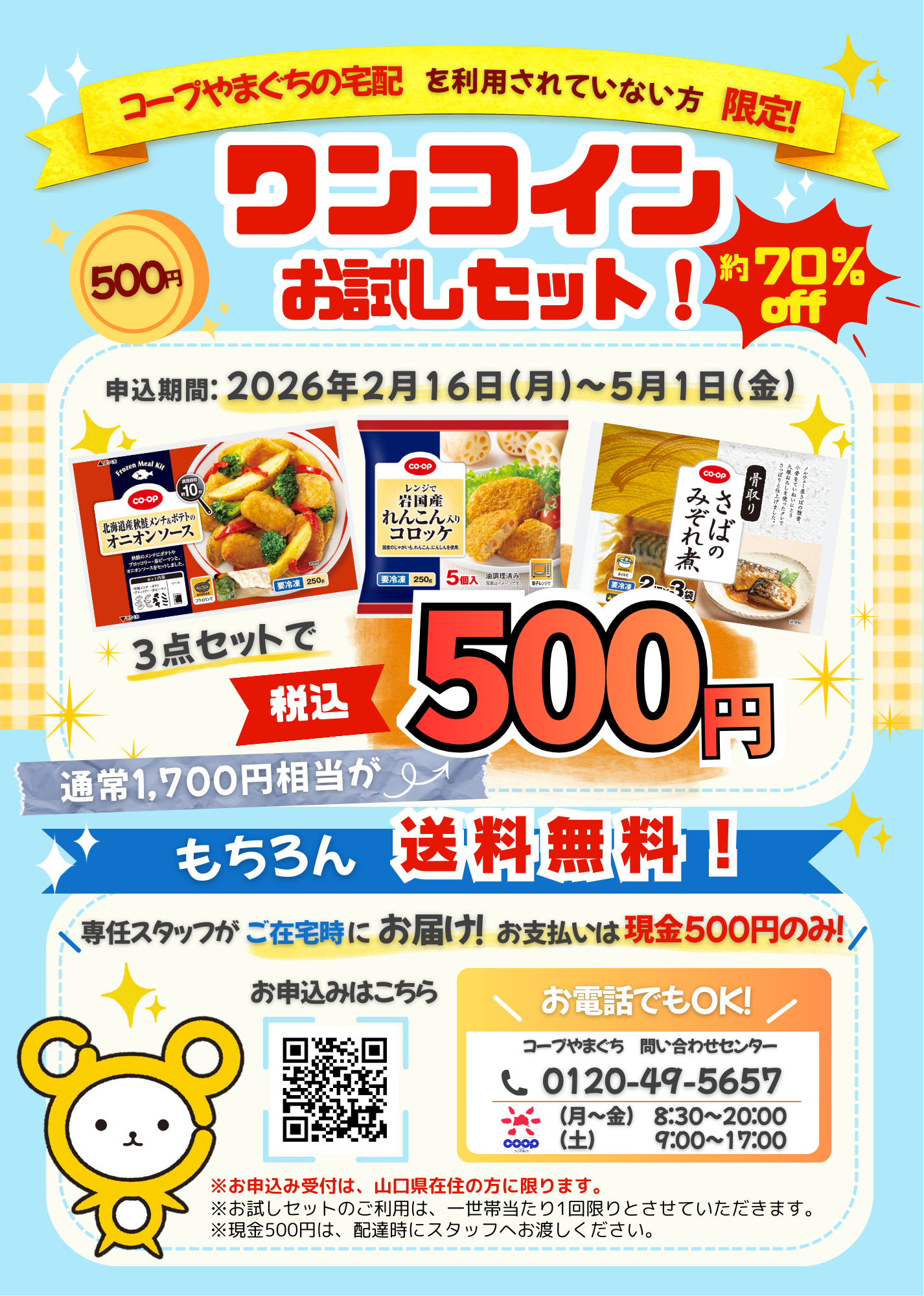 ※「宅配ワンコインお試しセット」は、コープやまぐちの宅配をご利用されたことのない方に限ります。